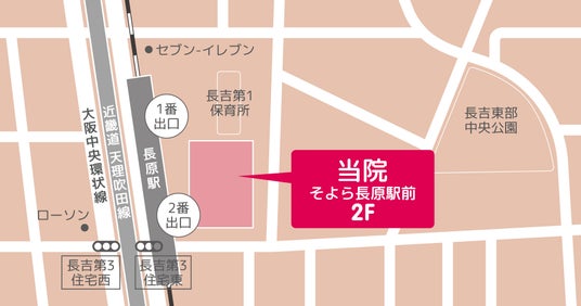 大阪メトロ谷町線「長原」駅より徒歩約1分の「そよら長原駅前」2階で、朝9時から夜21時まで、土日祝日も毎日診療を行います。