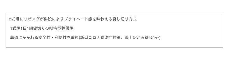 さらに、この式場においては「ご遺族様が安心して故人とのお別れの時を過ごせるよう」、お客様によりそったサービスを展開してまいります。