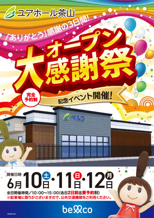 ベルコとしては、同エリアにおいて「式場にリビングが併設」の邸宅型となる葬儀場開設であり、今まで以上に「お客様に寄添うサービス」を展開してまいります。また、地域の皆様に幅広くご利用していただく機会を得るべく、6月10日(土)~6月12日(月)までの3日間、同施設にて「オープン大感謝祭」を開催いたします。