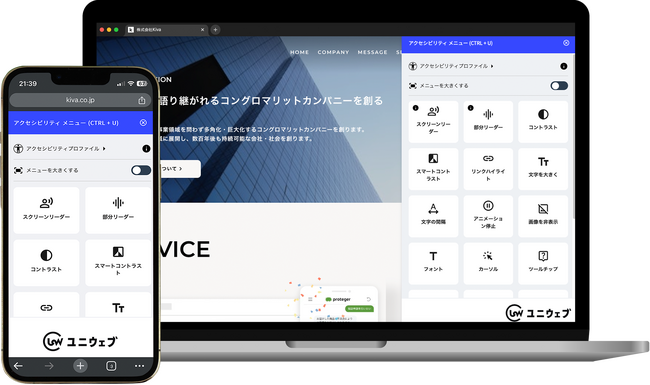 ユニウェブは、すべてのウェブサービスにコード一行を追加するだけで「導入当日」にウェブアクセシビリティ機能をサポートします。