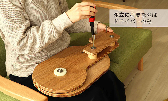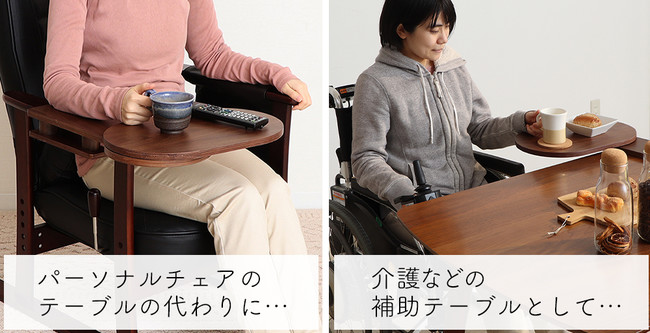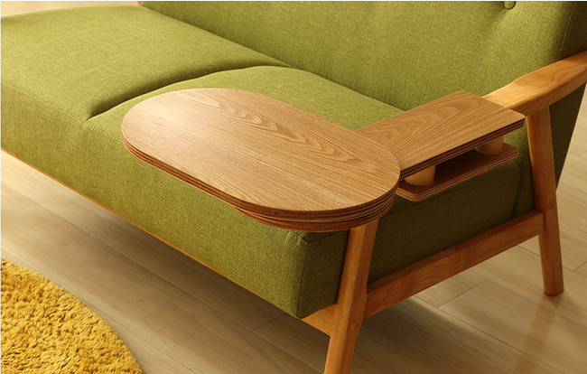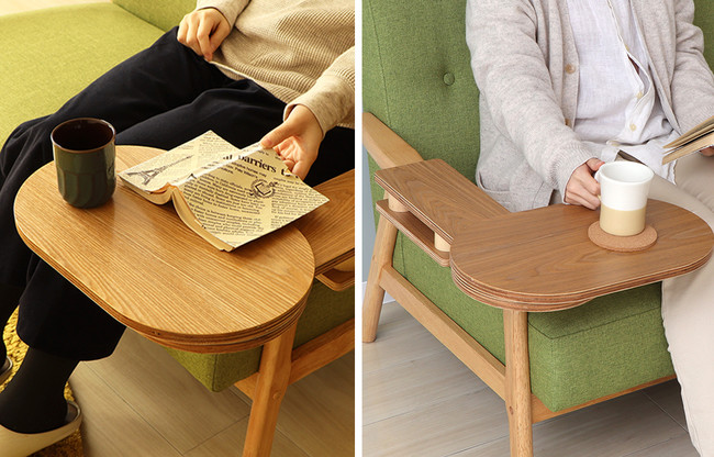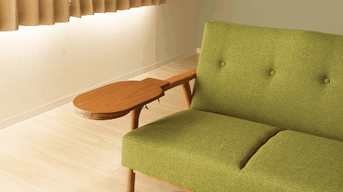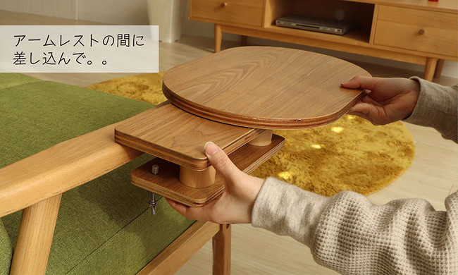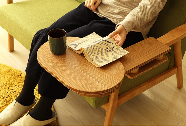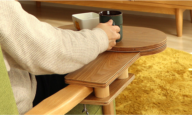 ソファの肘にテーブルを取り付ける形なので、必然的に肘の高さと同じ位置になり、とても使いやすいテーブルとなります。