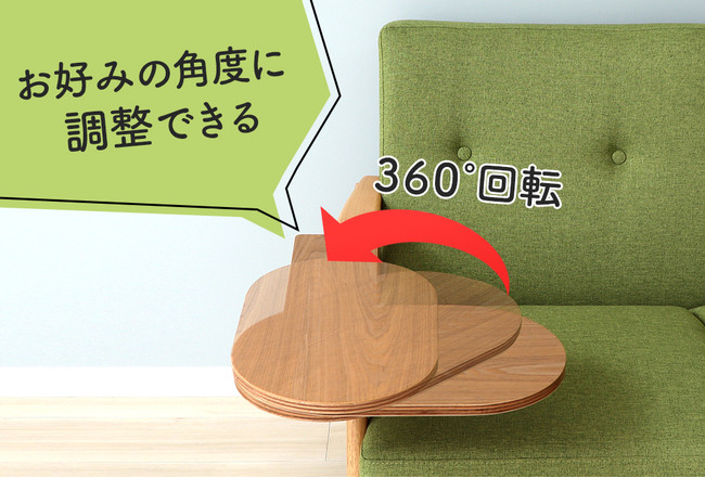 テーブルの天板は360度回転します。使うときだけ90度回転させ、自分の手元に向けられます。使うときだけサッと出せる便利なテーブルです。