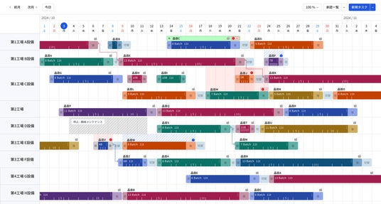 - - 多工程にわたる複雑なバッチ生産にも対応し、各工程の順序制約や保管所の上下限を考慮しながら、生産計画草案を独自AIが自動作成