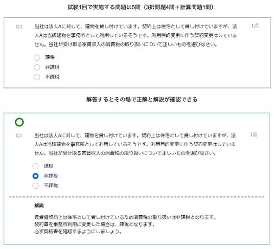 週に1回、5問の会計・税務に関する問題がメールで配信され、理論知識と実務ベースの知識を習得できます。問題には、辻・本郷グループのコンサルタントが実際に経験した事例も含まれています。