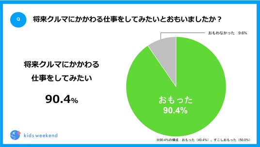 「クルマはすきですか?」という問いに36.5%が「ふつう」と回答していたのに対し、授業を受け96.2%が「クルマやモビリティに興味を持った」と回答。更に「将来クルマにかかわる仕事をしてみたいと思った」と回答した人が90.4%という結果になり、車に対する理解を深めることで、子どもたちの新たな興味を引き出すことに成功しました。