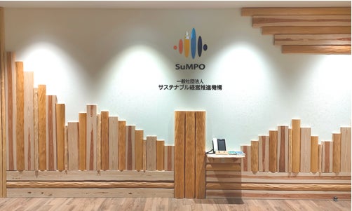 一般社団法人サステナブル経営推進機構のエントランスには、北山丸太をそれぞれ異なる大きさで挽き割った板材を用い、北山地方特有の育林方法である「台杉仕立て」 を表現。