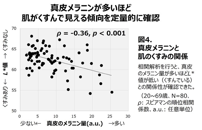 20歳から69歳までの女性80名にご協力いただき、光音響法を用いて頬部位の真皮のメラニンを定量し、同じ部位のL*値との関係性を調べました。その結果、真皮のメラニン量が多いほど肌がくすんでいる(L*値が低い)傾向が明らかになり、真皮中のメラニンの蓄積が肌のくすみに影響することが定量的に示されました(図4)。