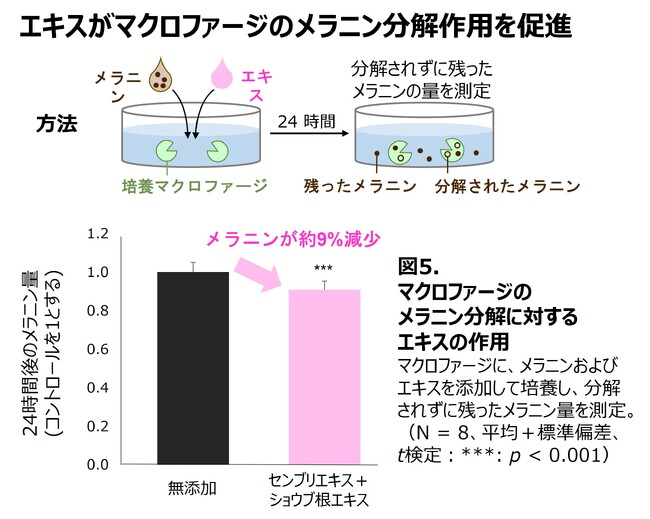 センブリエキスとショウブ根エキスの混合物を培地に添加すると無添加時に比べてメラニン量が少なくなったことから、エキス添加によりマクロファージのメラニンを取り込み分解するはたらきが促進されたことが示されました(図5)。