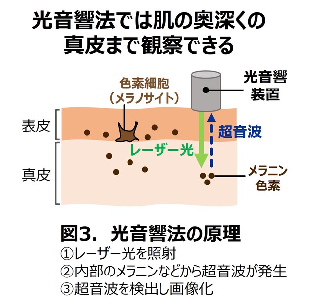 近年開発された光音響法では、メラニンなどの構成物が特定の波長の光を吸収し超音波を発することを利用して肌内部を観察できます(図3)。