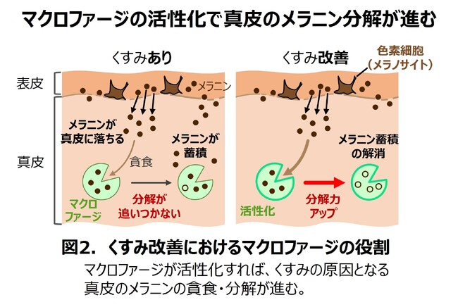 真皮にメラニンが蓄積している肌では、メラニンの落ち込みが多く、分解が追いついていないと考えられます。そこで、改善方策の検討において、免疫細胞の一種であるマクロファージに着目しました(図2)。マクロファージはダメージを受けた組織や細胞、雑菌などの異物を貪食(※2)する役割を持ち、メラニンも取り込むことが報告されています。