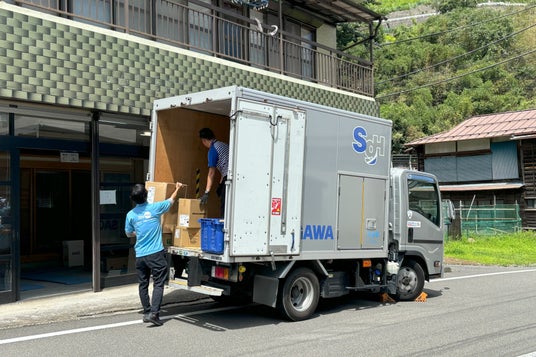 共同配送の荷物集約拠点(ドローンデポ(R)小菅村)で荷下ろしするNEXT DEVELIRYスタッフ