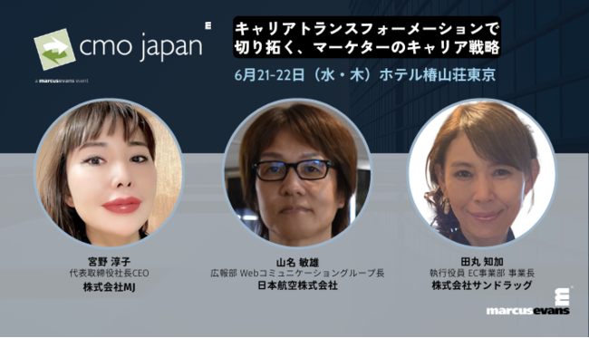 マーカス・エバンズ・イベント・ジャパン・リミテッド(本社:英国/日本支社代表:雪下 大輔、以下「マーカスエバンズ」)が主催するマーケティング部門のビジネスサミット『CMO Japan Summit 2023』のインターラクティブセッションに株式会社MJ 宮野 淳子氏、日本航空株式会社 山名 敏雄氏、株式会社サンドラッグ 田丸 知加氏のご登壇が決定いたしました。