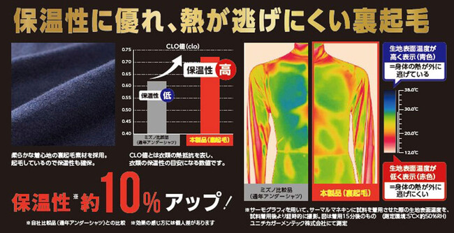 またそれだけでなく、従来のミズノ製裏起毛アンダーシャツと比較して、保温性が約10%UP!