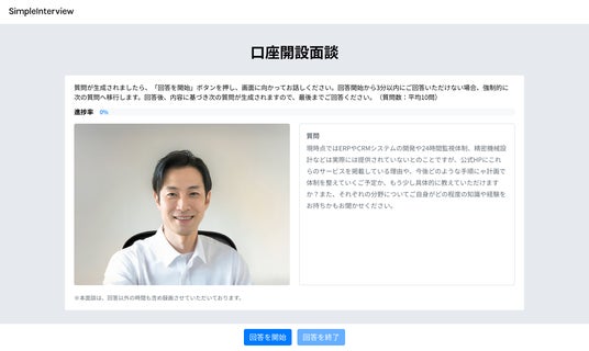 GMOあおぞらネット銀行株式会社(東京都渋谷区、代表取締役会長 金子 岳人、代表取締役社長 水町 哲、以下「GMOあおぞらネット銀行」)とシンプルフォーム株式会社(東京都目黒区、代表取締役CEO 田代 翔太、以下「シンプルフォーム」)は、シンプルフォームが提供するAI面談プロダクト「SimpleInterview(シンプルインタビュー)」をGMOあおぞらネット銀行の法人口座開設審査プロセスに本格導入することをお知らせします。両社は、2025年9月より同プロダクトの導入検証※1を進めてきましたが、1.従来の審査と同等以上の品質担保が確認できたこと、2.お客さまからの申告・提出情報をAI面談によって確認することで、書類不備の低減が図られお客さま満足度向上につながること、3.結果としてGMOあおぞらネット銀行の審査プロセスが従来比で33%向上※2し、お客さまがお申込から口座をご利用いただくまでの時間を短縮でき、お客さまの利便性に資するという結果を得られたため、このたび正式導入に至りました。