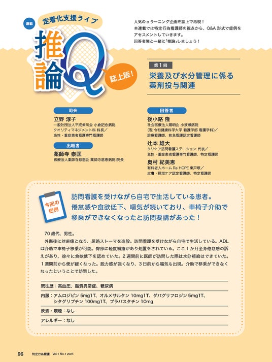 「特定行為研修修了者の実践事例が読みたい」という多くの声に応え、毎号、共通科目・区分別科目・領域別パッケージからそれぞれ1科目(領域)を取り上げ、特定行為を実践した事例について手順書とともに紹介します。特定行為研修修了者が臨床で遭遇しがちな、もしくは判断や対応などに迷う場面について、「医師からのコメント」としてその評価も掲載。実際の手順を具体的にイメージできる、実践ですぐに役立つシリーズ特集です。