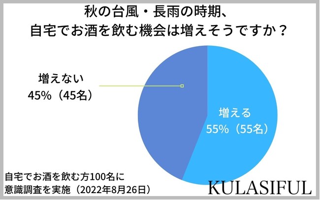 弊社では、自宅でお酒を飲む方100名を対象に「秋の台風の時期に家飲みの機会が増えそうか」について調査を行ったところ、「増える」と答えた方が55%、「増えない」と答えた方が45%と、過半数が台風に備えて、自宅でお酒を楽しむ機会を増やすと回答しました。