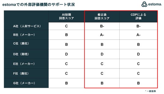 今回、estomaを活用して作成した回答に対するスコア予測は、CDP2025で実際に発表された最終スコアと完全に一致(合致率100%)し、estoma AIの精度が実証されました。