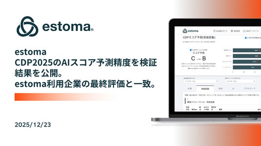 ESG情報統合管理クラウド「estoma(エストマ)」を提供する株式会社estoma(本社:東京都千代田区丸の内、代表取締役:伊藤総一郎)は、estomaのAI機能を活用して作成・支援した企業のCDP回答において、AIによるスコア予測がCDPより発表された最終評価と100%合致したことをお知らせ致します。本結果は、estomaが提供するAI回答生成、スコアシミュレーションの精度の高さを証明しました。今後もestomaは、企業のCDP対応における大幅な業務効率化と評価向上に貢献してまいります。