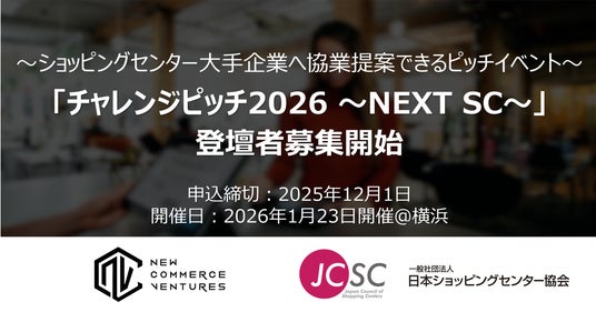 コマース・リテール領域のインダストリーベンチャーキャピタルNew Commerce Ventures株式会社(本社:東京都品川区、代表取締役:松山馨太・大久保洸平、以下「NCV」)は、一般社団法人日本ショッピングセンター協会と共催する「チャレンジピッチ2026 ~NEXT SC~」において、ピッチイベントに登壇する企業の募集を開始しましたのでお知らせいたします。