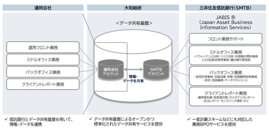 業界全体で利用・共有できるスキームを構築しデータの利活用を促進することで、一者計算を実現し、システムを含むミドル・バックオフィス業務の標準化を図ることは、運用会社の業務効率化と新規参入の促進に寄与すると考えています。両グループは今後もお互いの知見を持ち寄り、本基盤、大和証券グループが運用会社に提供するITソリューション、三井住友トラストグループが運用会社向けに提供するBPOサービス(※2)(JABIS(R)(※3))を組み合わせることにより、業界全体の効率化と発展に貢献していきます。
