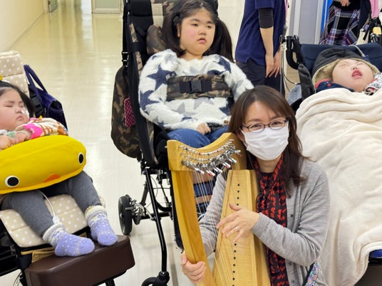 重い障がいのある子どもたち。ハープの音色に合わせて歌ったり身体を動かしたり。