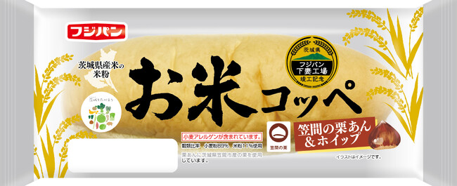 茨城県産米の米粉を使用したコッペパンに笠間の栗あんとホイップクリームをサンドしました。