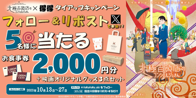 株式会社家族亭(本社・大阪府大阪市、代表取締役社長・坪山 憲司)が運営するそば和食チェーン「家族亭」、うどんチェーン「得得」は、2023年10月13日(金)~10月27日(金)の期間に、映画「北極百貨店のコンシェルジュさん(10月20日公開)」とタイアップしてフォロー&リポストキャンペーンを実施します。家族亭、得得それぞれの公式X(旧Twitter)をフォロー&リポストすることで簡単に参加でき、抽選で各5名様にお食事券と映画「北極百貨店のコンシェルジュさん」公開記念グッズ3点セットが当たります。