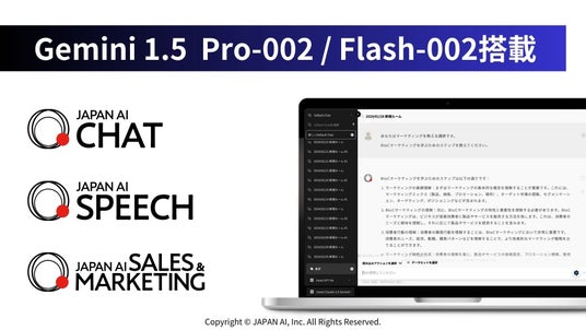 JAPAN AI株式会社(本社:東京都新宿区、代表取締役社長:工藤 智昭、以下JAPAN AI)は、提供しているAIサービス「JAPAN AI CHAT」「JAPAN AI SPEECH」に、Google LLC(本社:アメリカ合衆国カリフォルニア州マウンテンビュー、社長:ルース・ポラット、以下Google)が提供する最新版LLM(大規模言語モデル)「Gemini 1.5 Pro-002 / Flash-002」を搭載したことをお知らせします。