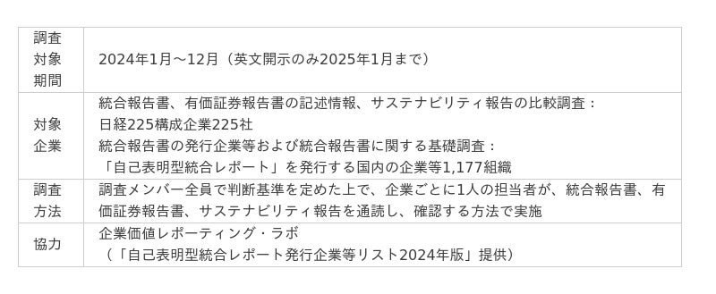調査の対象は、日経平均株価※1(以下、日経225)の構成企業が発行した統合報告書、有価証券報告書、サステナビリティ報告書や企業ウェブサイト上のサステナビリティに関連するページ(これらを総称して、以下「サステナビリティ報告」)、および2024年1月~12月に「自己表明型統合レポート」を発行する国内の企業等1,177組織が発行した報告書としています。