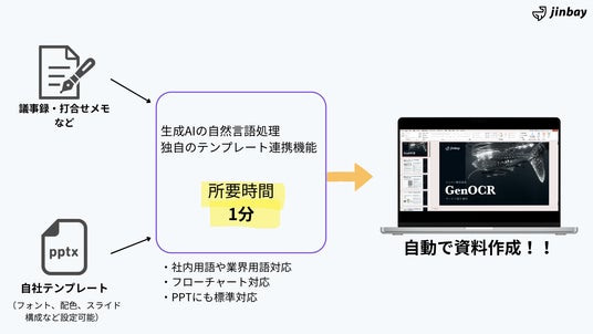 ジンベイ株式会社(本社:神奈川県横浜市、代表取締役:上田英介)は、生成AIを活用した資料作成サービスの提供を開始しました。会議録やマニュアル原稿などをもとに、社内フォーマットに沿った高品質なPowerPoint資料を自動生成し、業務の効率化とナレッジ共有を支援します。