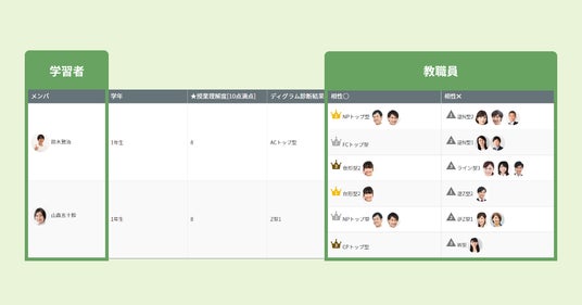 教職員もディグラム診断の受講できます。この診断を通じて教職員と学習者の相性を分析することが可能となります。性格だけではなく、ヨリソルに蓄積している成績情報や志望校レベルなどの学習者情報に加え、担当科目などの教職員情報などを活用した相性分析が可能となります。