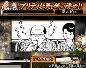 近藤静也の母、妙の「半丁」対決や、プリティ社員を酔い潰した回数に応じて報酬が獲得できる「酔い潰し対決」、酔った大久保親分を止める「斬るっ!」など、様々なミニゲームをお楽しみいただけます。