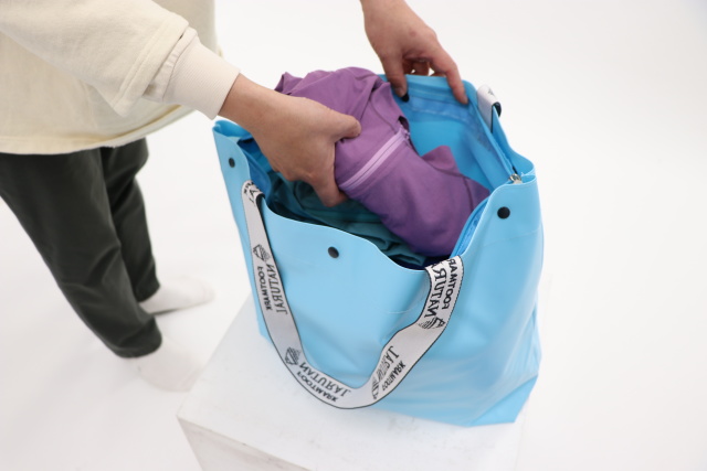 ・防水加工されたトートバッグに洗濯ネットが内蔵されており、ボタンを外せばそのまま洗濯機へ入れられます。自宅での「バッグ→洗濯ネット」への入れ替えが不要です。