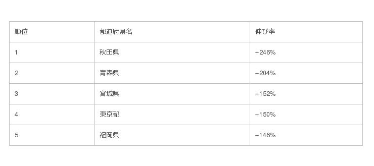 国内の伸び率では、1位が+246%(約3.5倍)の伸びを見せた秋田県、2位が+204%(約3倍)の青森県、3位が+152%(約2.5倍)の宮城県で、東北地方の県がトップ3を占めました。この3県では、“東北三大祭り”といわれる「秋田竿燈まつり」「青森ねぶた祭」「仙台七夕まつり」をはじめさまざまな夏祭りが開催され、多くの観光客が訪れます。1位の秋田県では特に東京(羽田)と大阪(伊丹)からの予約が伸長し、全体の伸びに貢献しました。2位の青森県は、昨年版の同ランキングでも1位に入っており、夏休みの旅行先として順調に人気を集めています。3位の宮城県では今年8月、エアアジア・ジャパンがLCCとして初めて仙台−名古屋(中部)線の就航を予定しており、国内からのアクセスがさらによくなる見込みです。