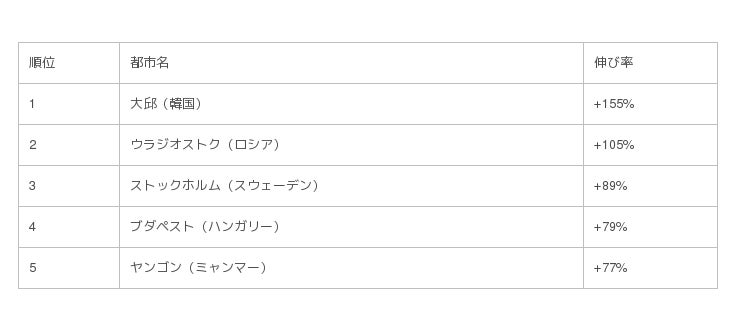 海外旅行では、韓国・大邱が+155%(約2.6倍)と大きく伸びて1位になりました。大邱は「2019年ゴールデンウイーク 人気急上昇の旅行先トップ5」でも伸び率1位にランクインしており、好調が続いています。チェジュ航空の成田−大邱線就航、エアプサンの北九州−大邱線就航など、昨年から今年にかけてのLCCによる便数増加が貢献しているとみられます。