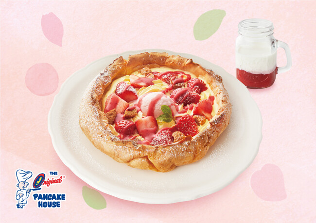 大人気のダッチベイビーに、コクのあるカスタードクリームとフレッシュストロベリーをトッピング。上からさらに、特製の『いちごミルクソース』をかけてお召し上がりいただきます。