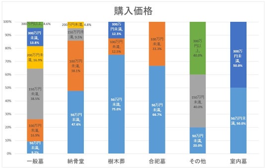 購入価格が最も安い傾向にあるのが樹木葬で、75%の方がかかった費用が50万円未満と回答。、次いで、合祀墓、室内墓、納骨堂と続く。それに対して購入価格が高いのが一般墓で、100万円~150万円未満と回答した方が約4割で他のお墓の形態と比べて価格帯の幅が大きい傾向もみられる。「なぜこのお墓を選んだか」の理由については、樹木葬を選んだ人は「価格が比較的安かった」「管理がしやすい」というコメントが多かった。一方、一般墓では「本来の墓の形として一番ふさわしい」「子供たちも使用できるから」というコメントを得られた。