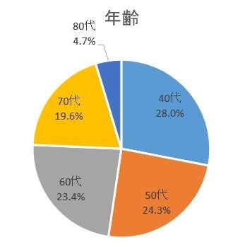 一番多かったのは、一般墓で60.7%、納骨堂が19.6%、樹木葬が7.5%という結果となった。また、年齢の内訳では年齢のグラフの通り、サンプル数は40代から70代までが約2割前後の割合となっている。また、お墓を購入した方の年代で最も多かったのが40代で28.0%、次いで50代(24.3%)、60代(23.4%)、70代(19.6%)と続く。