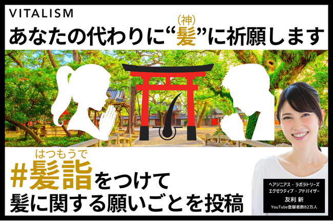 VITALISMは髪や頭皮にお悩みのあるひとの力になりたいとの思いで「髪詣(はつもうで)キャンペーン」と題し、2024年1月1日(月)~1月8日(月)まで髪や頭皮にまつわる願いを公式Xにて大募集します。ご応募いただいた方全員に株式会社ヘアジニアス・ラボラトリーズエグゼクティブ・アドバイザーである友利新のサイン入りメッセージカードをプレゼントいたします。