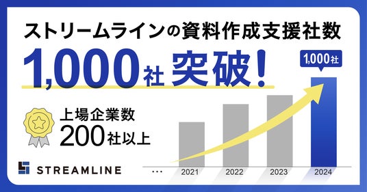 株式会社ストリームライン(本社:東京都品川区 代表取締役:梶山 洋二 以下「ストリームライン」)は、資料作成代行サービスの累計支援社数が1,000社(累計上場企業数200社)を突破いたしました。