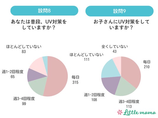- ママ自身のUV対策は毎日が多数だが、子どもへの実施頻度は生活状況により差あり