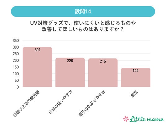 ▶︎ 使用感や扱いにくさに関する課題が多く挙がり、お子さんへのUV対策を難しくしている一因と考えられます。