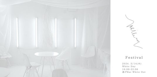 2024年3月14日ホワイトデーに、見渡す限り真っ白な天国のような会場「逃げBar White Out」にて、ドレスコード白で集まり、サイレントフェスに加え、白にちなんだ食事や、リラクゼーションをお楽しみいただくイベントを開催いたします。