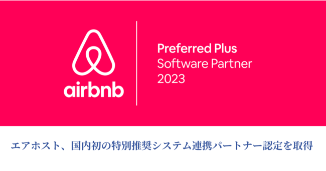 株式会社エアホスト(本社:東京都渋谷区、 代表取締役:尾畠 隆志、以下 エアホスト)は、2023年2月、世界最大級の旅行コミュニティプラットフォームのAirbnb(本社:米国カリフォルニア州サンフランシスコ、以下:Airbnb、日本語名:エアビーアンドビー)から、実績上位のシステム連携パートナーに与えられるAirbnb Preferred Plus Software Partner(Airbnb特別推奨システム連携パートナー)に3年連続で選ばれました。