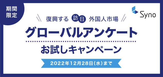 グローバルの消費者を対象とするアンケートの収集、分析、活用のプロセスを最適化するデータプラットフォームを開発するSyno International(本社:リトアニア)の日本支社、Syno Japan株式会社(本社:神奈川県鎌倉市、代表取締役:長野草児、URL: https://synoint.jp/、以下シノ・ジャパン)は期間限定のキャンペーンとして、訪日意向がある訪日旅行潜在層を対象としたグローバルアンケートを皆様によりご利用しやすいパッケージにて特別価格でご提供いたします。