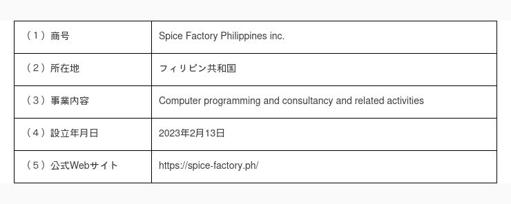 また、グローバル展開を加速させるための拠点として、現地法人である「Spice Factory Philippines inc.」を活用し、グローバル企業とのコミュニケーションを円滑にして顧客のニーズを捉えることで、迅速かつ高品質なサービスの提供を目指す目的があります。