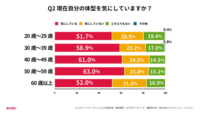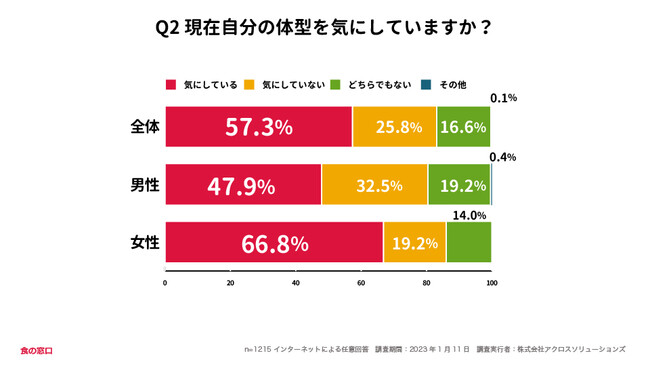 全体の結果では57.3%の過半数以上が現在の体型を気にしていることが分かりました。
