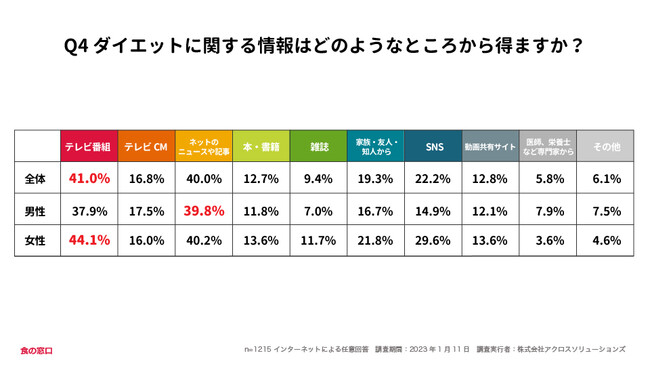 全体の結果では「テレビ番組」が41%、「インターネットのニュースや記事」が40%と、ダイエット情報を得るメディアとして大きな割合を占めていることが分かりました。