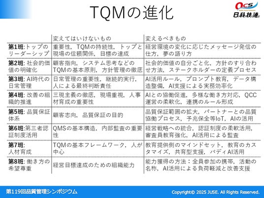 プログラムの最後では、主担当組織委員の山田氏から「第119回QCSのまとめ」が説明された。冒頭に、「品質に関する見識を持つ参加者が、膝を突き合わせて議論すれば方向が見えてくる」と話した通り、グループ討論での議論の中で見出された「変えてはならないもの、変えるべきもの」を紹介し、QCSを締めくくった。