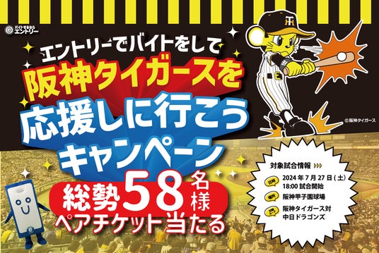 “人と仕事の縁むすびに挑戦し続ける”を企業理念に、主にお仕事紹介サイト「スマジョブ」やお仕事マッチングサービス「シェアジョブ」を運営する株式会社エントリー(本社:東京都新宿区、代表取締役:寺本潤、以下エントリー)は、2024年7月27日(土)に開催される阪神タイガースvs中日ドラゴンズ戦に冠協賛いたします。
